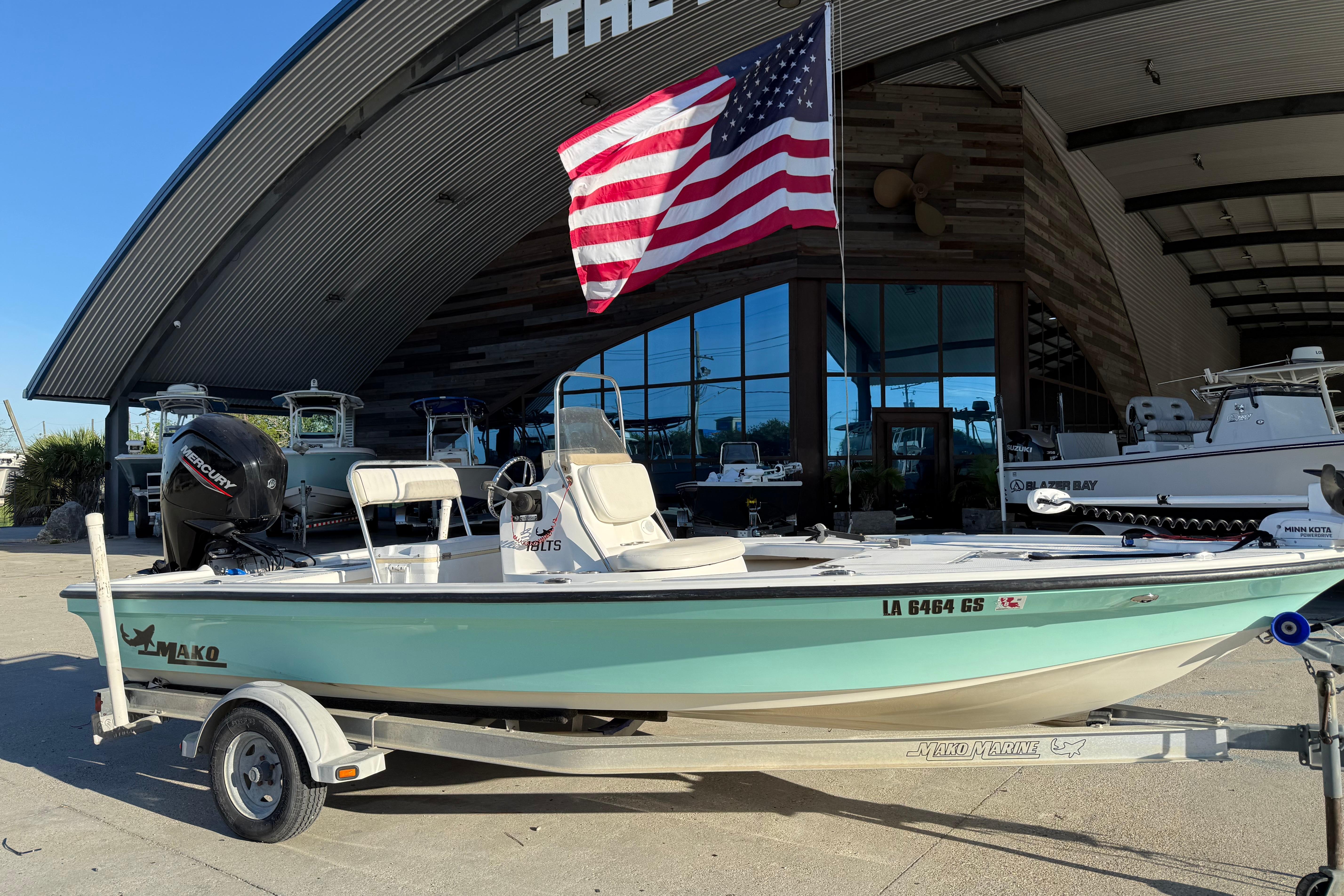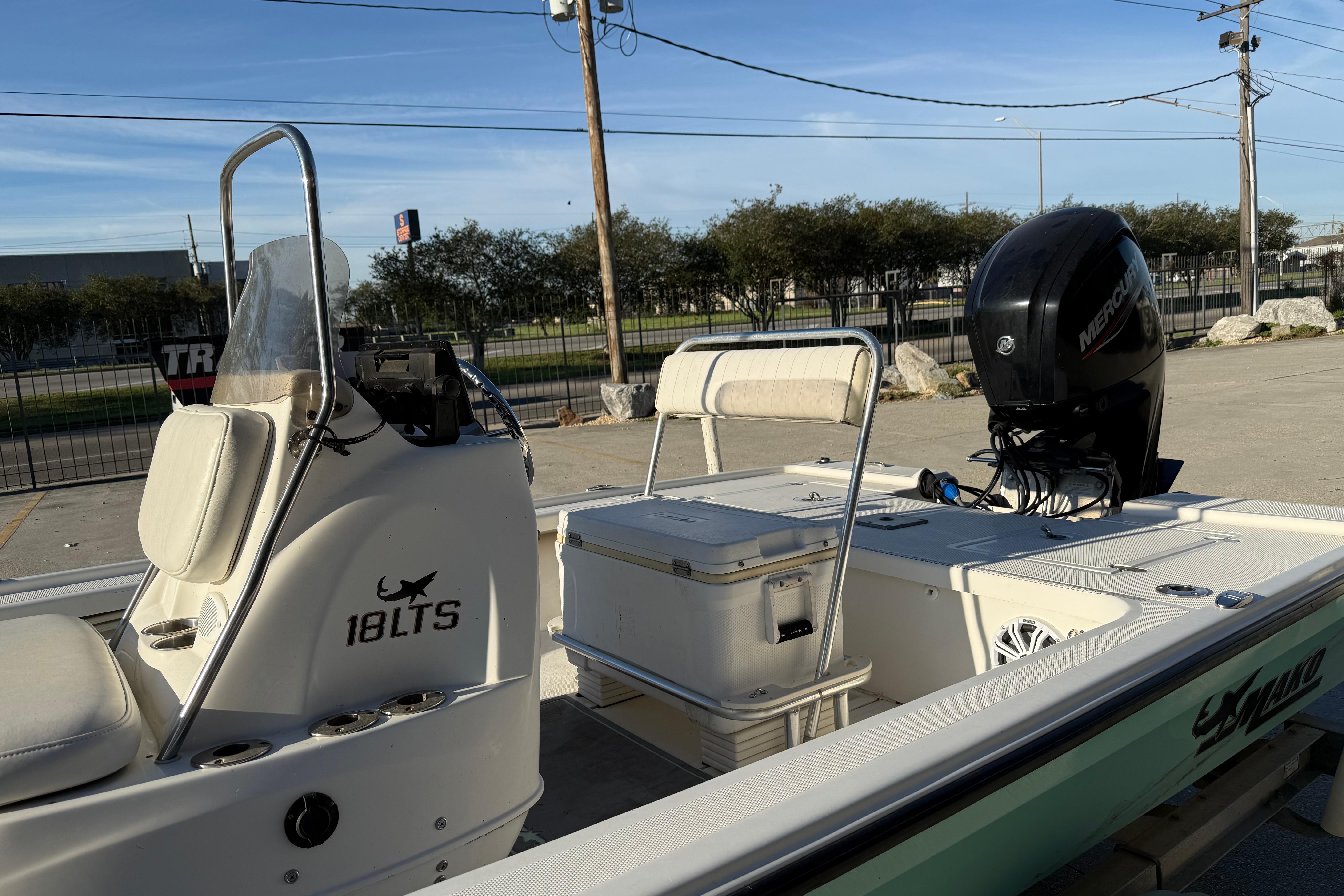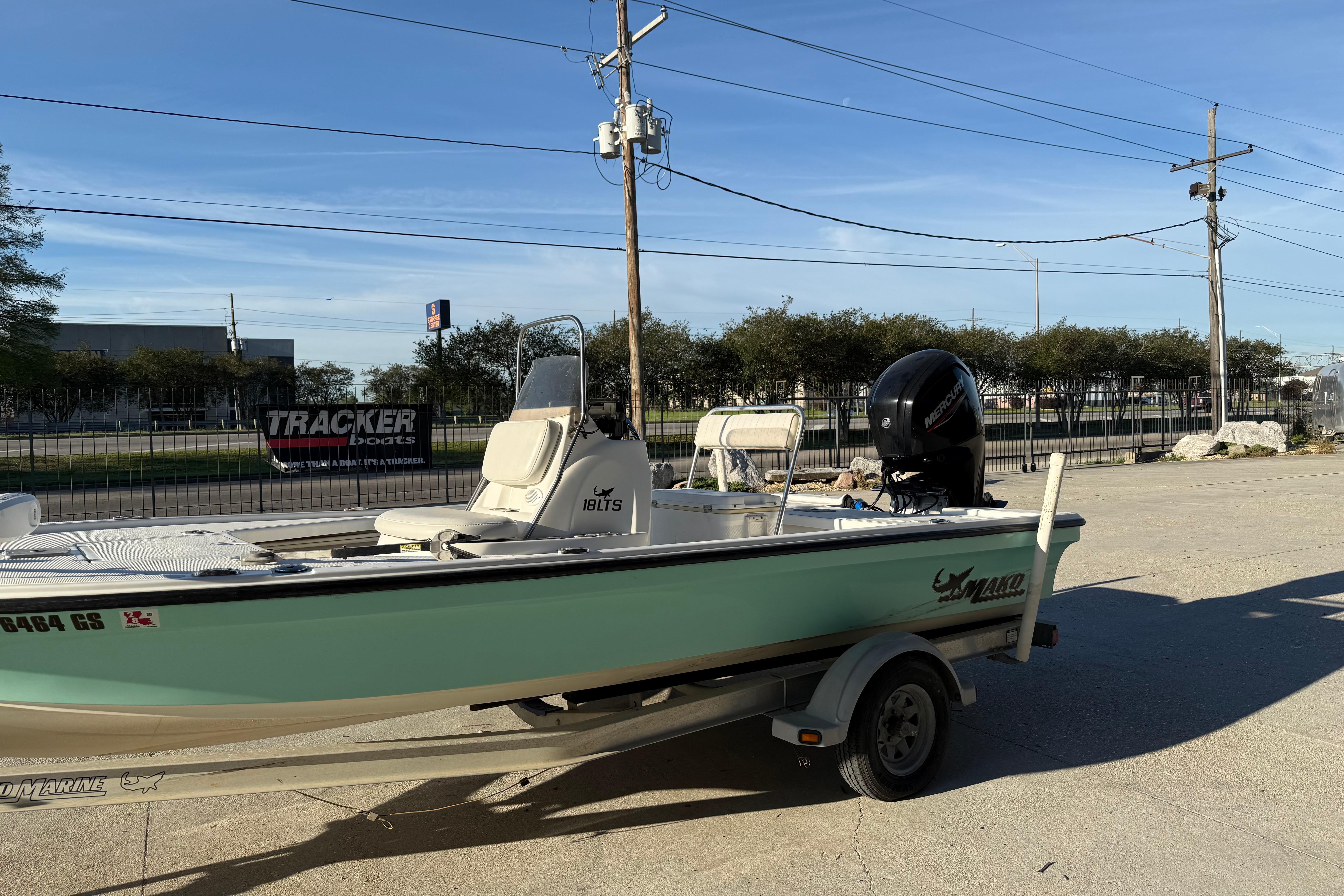 The MAKO 18 LTS is a whole new breed of bay boat. It takes the features, ride and versatility of larger craft and perfectly melds them with the maneuverability and shallow draft of an inshore boat. The patent-pending Rapid Planing System not only pushes the 18 LTS up on plane in record time, but it can do it in only 24" (60.96 cm) of water! All with less horsepower! And for fishing versatility, no other boat even compares. Generous bow and stern platforms are perfect for sight casting. If you prefer to stalk your fish through extreme shallows, you can get the optional poling platform, push pole and holders. For even more big-boat performance options, optional trim tabs, jack plates and hydraulic steering are ready to take your bay fishing trip to the max. However you choose to outfit your 18 LTS, this light tackle skiff is built to impress with its smooth ride, long list of features and all-around versatility.Features: Completely bonded and lined hull/deck assembly Deep ventilated step hull w/integrated transom knee laminated into hull Flip-flop helm seat w/72-qt. (68.14 L) cushioned cooler Center console w/analog gauges, removable windscreen, grab rail, stainless steel steering wheel and vertical rod holders Forward console seat w/18-gal. (68.14 L) aerated baitwell Raised fore and aft casting decks w/watertight storage compartments w/close-molded lids Stainless steel rod holders, cleats and bow and transom eyes Self-draining deck Aluminum single-axle trailer w/EZ lube hubs