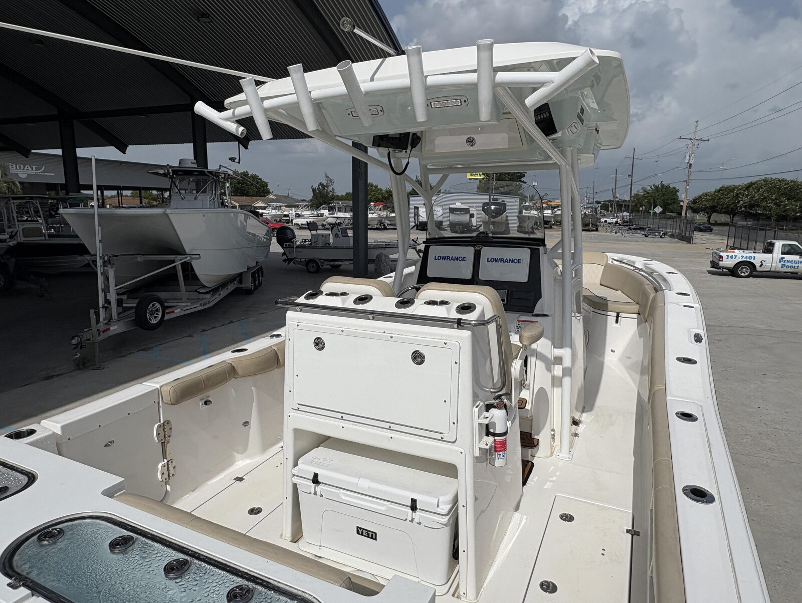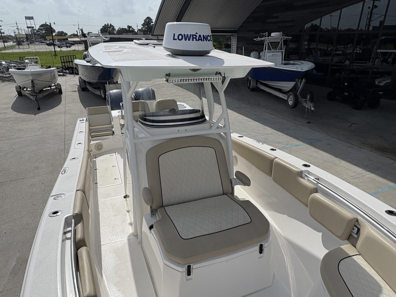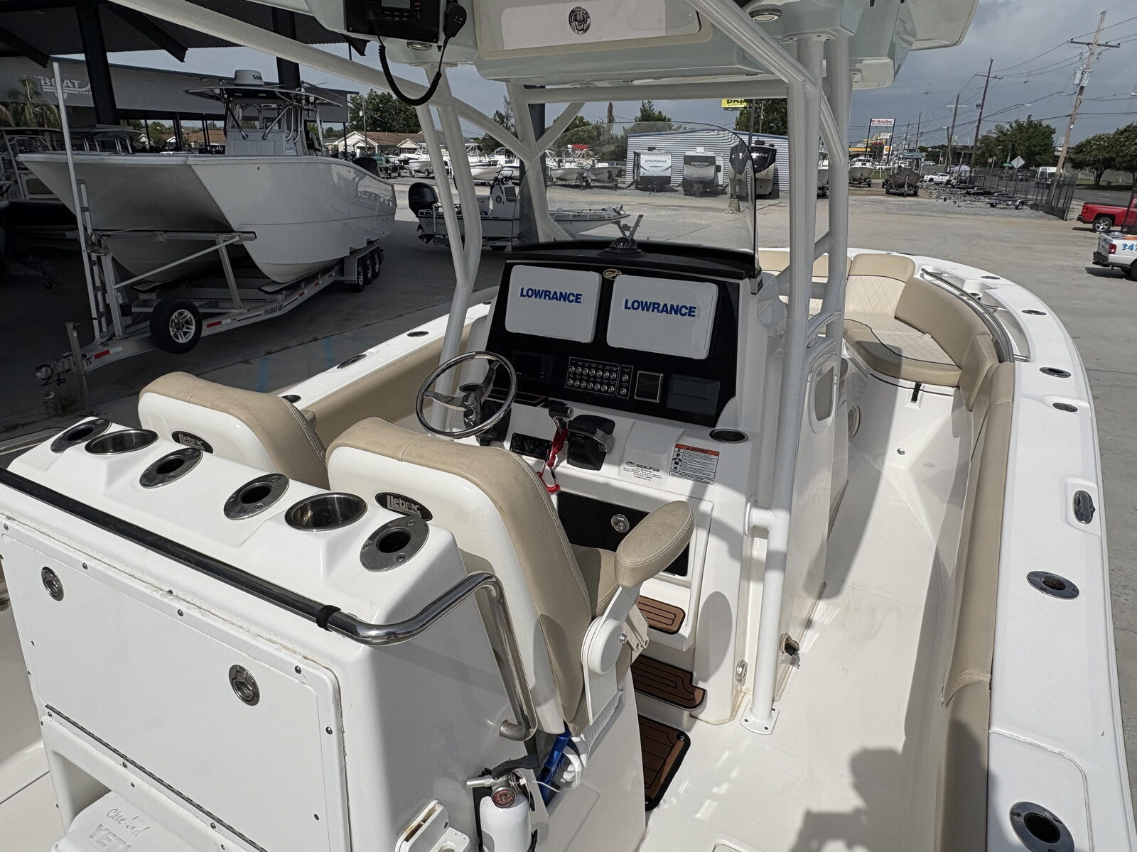 - Seating - Fiberglass helm pod w/deluxe fiberglass-backed bucket seats, 65-qt premium cooler & rigging station