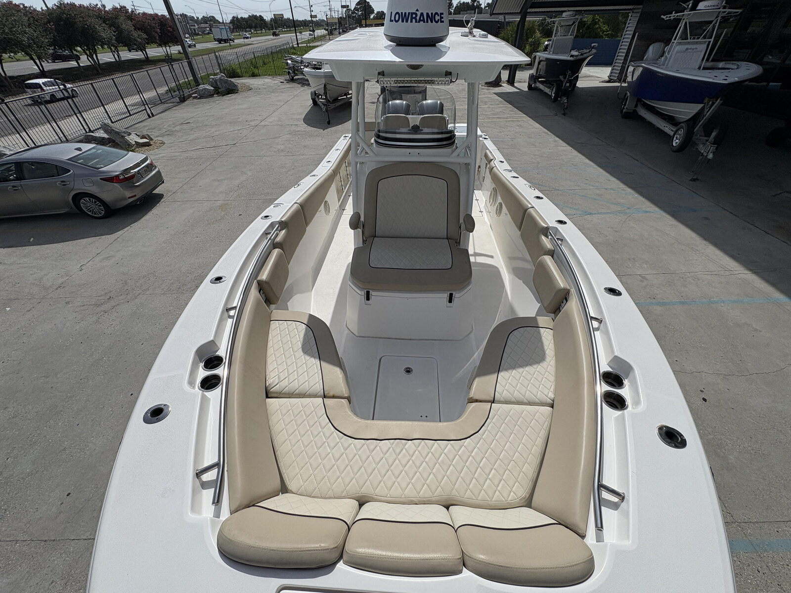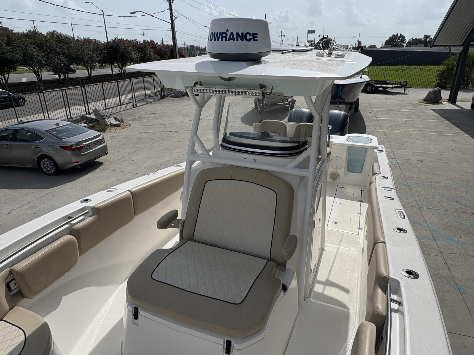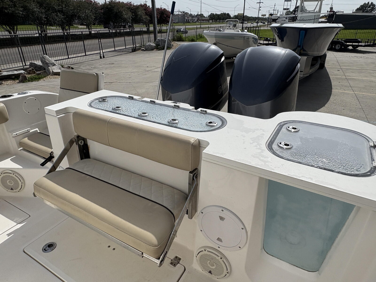 - Seating - Fiberglass helm pod w/deluxe fiberglass-backed bucket seats, 65-qt premium cooler & rigging station