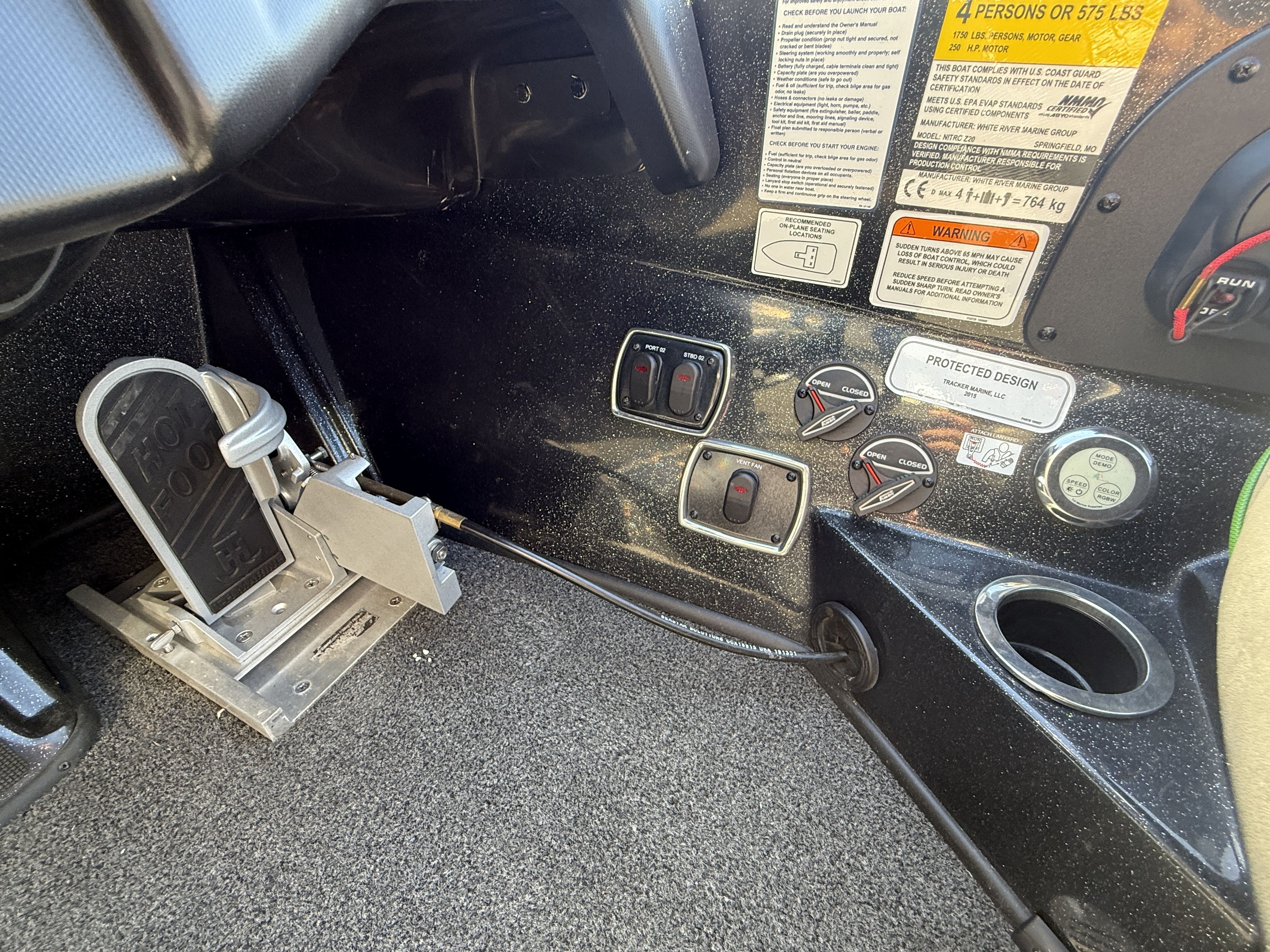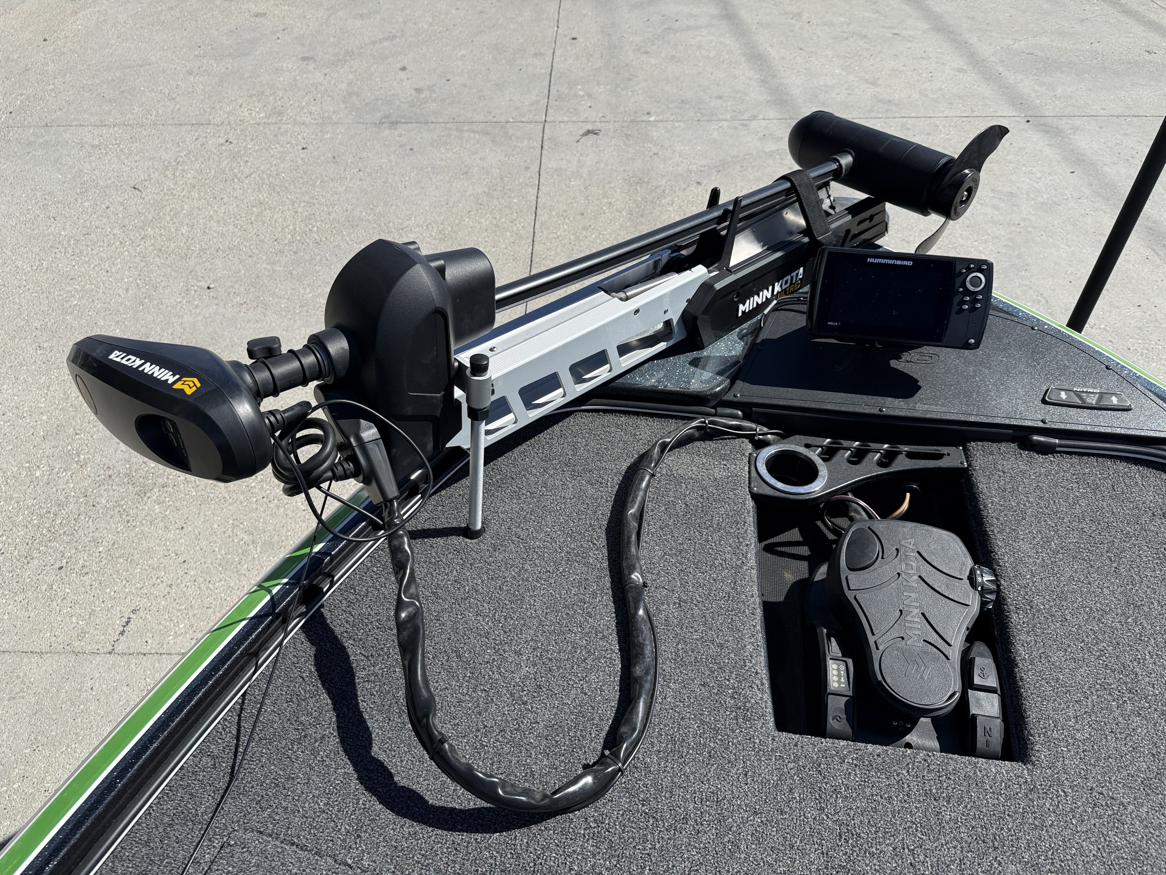 - Angled bow panel w/trolling motor receptacle, anchor/light switch & trim switch