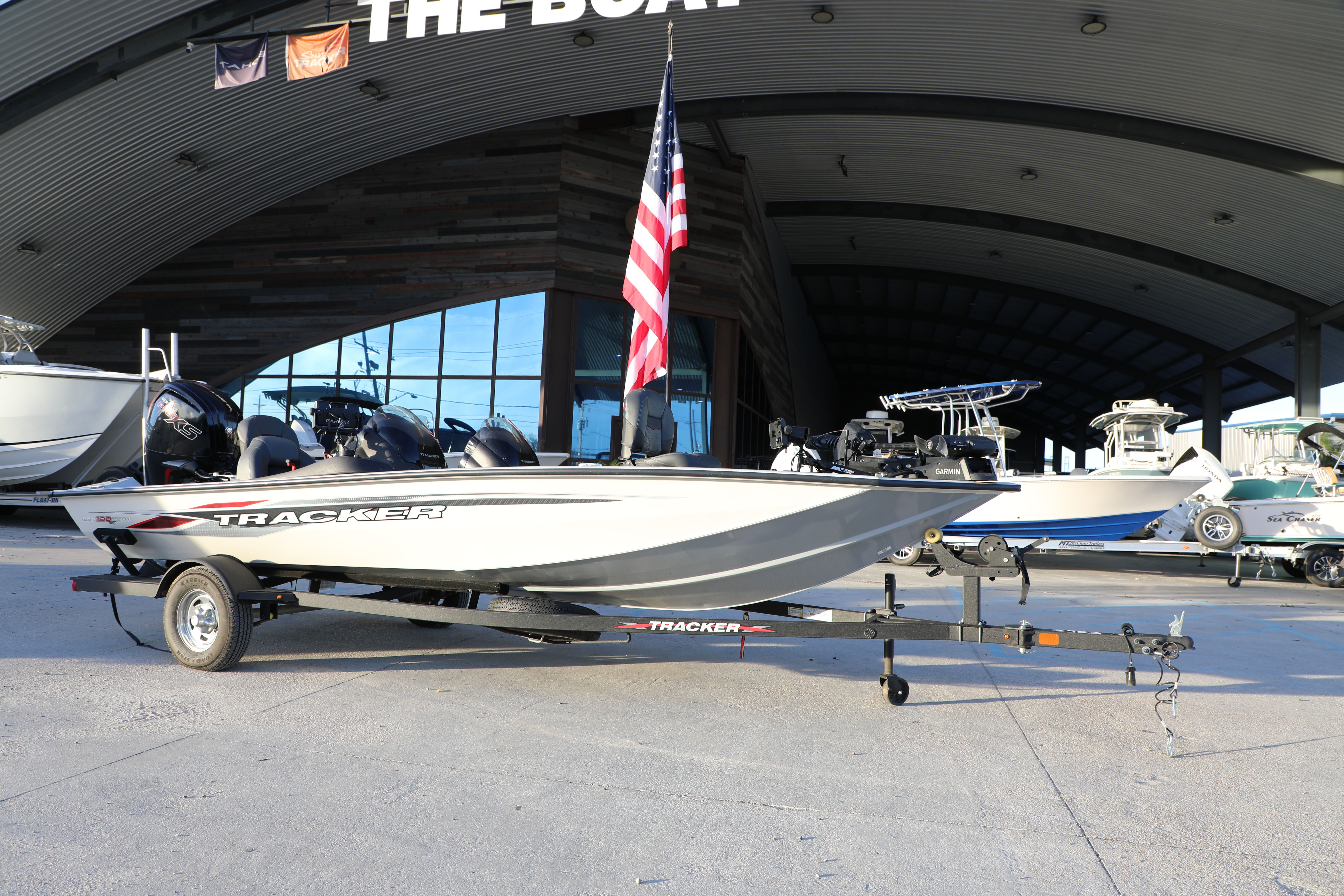 The Tracker Pro Team 190 is an 18' 7" aluminum bass boat with a 7' 5" beam, designed for up to 4 people, featuring a 125 HP max rating, a 21.5-gallon fuel tank, and built with a 0.100 marine alloy hull, offering tournament-ready features like livewells and ample storage with a focus on stability and fishability. Key specs include a ~1050 lb dry weight, 18" interior depth, 10-degree transom deadrise for stability, and a package weight around 2330 lbs.
