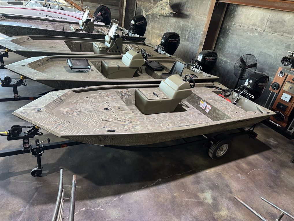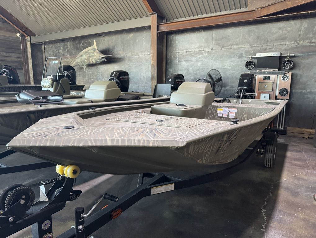 Check out this 16' Tracker Grizzly, an all-welded camo hull powered by a brand-new 50HP Mercury and sitting on a new single-axle trailer.