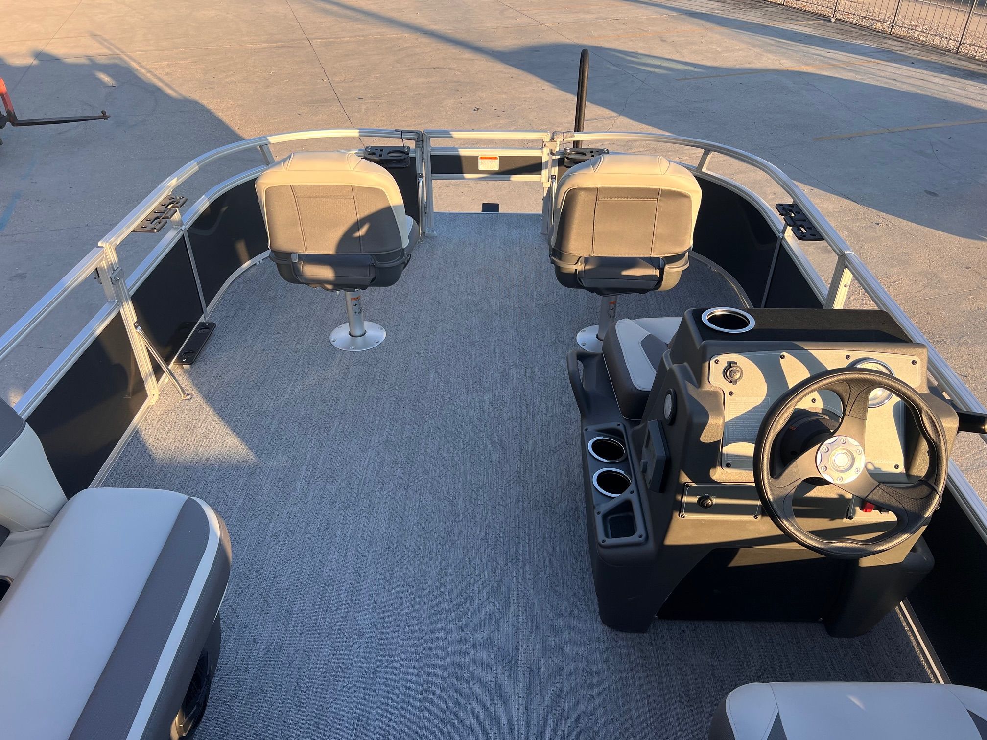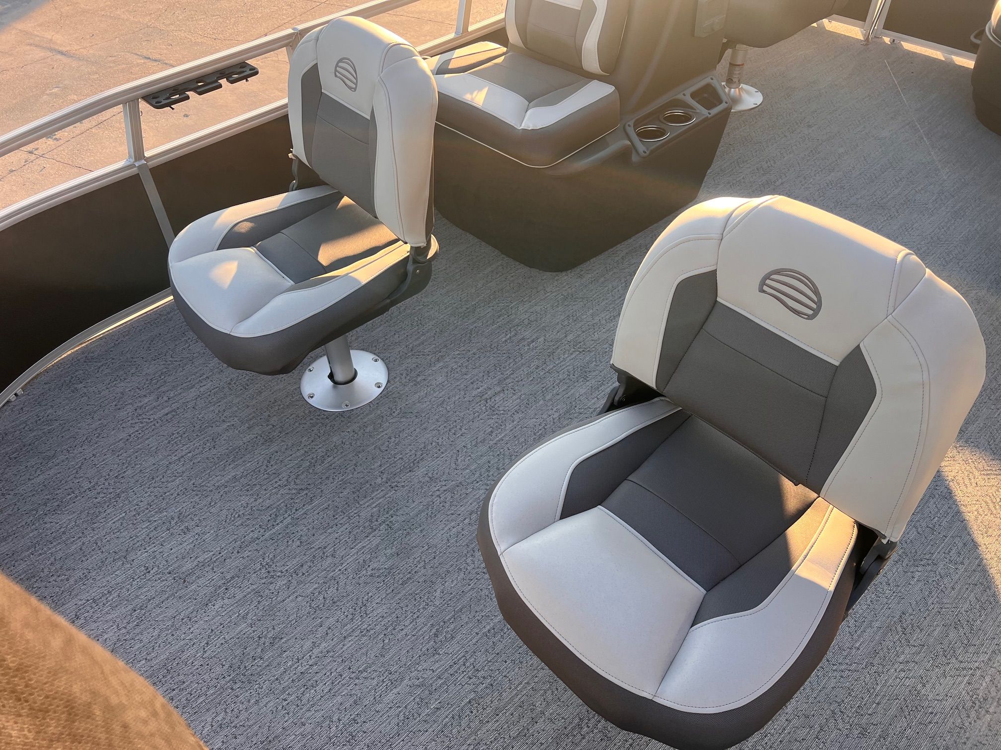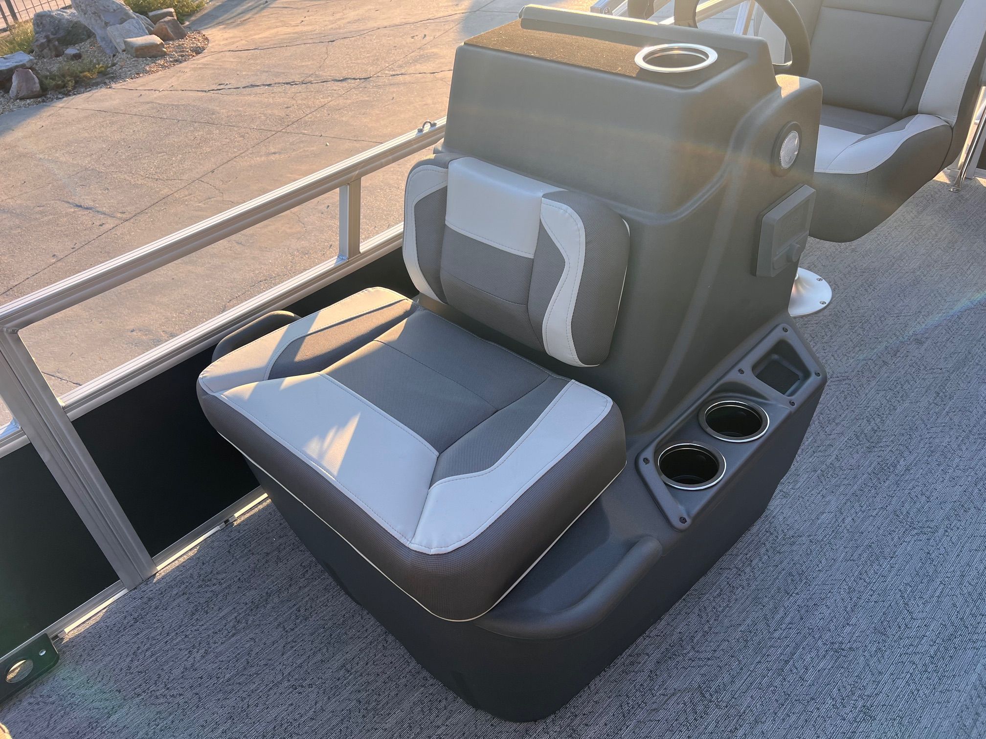 This seven-passenger fishing pontoon hits the water with new console and lounge designs. Get three extra cubic feet of storage thanks to clever backrest cut-outs. The redesign also adds a seat in front of the driver console, phone compartments, and four more cupholders. Cast from the shade of a standard 7' bimini top in one of the two folding fishing seats. Find your spot on the lake from the decked-out driver console, which comes with its own rod holder.