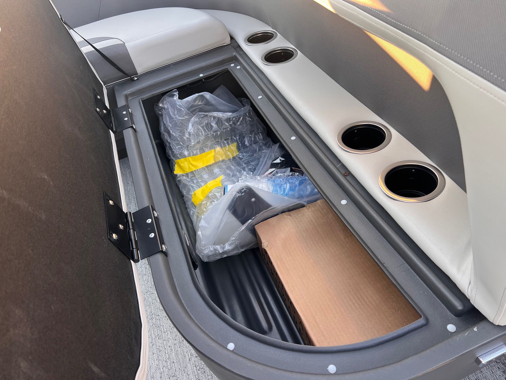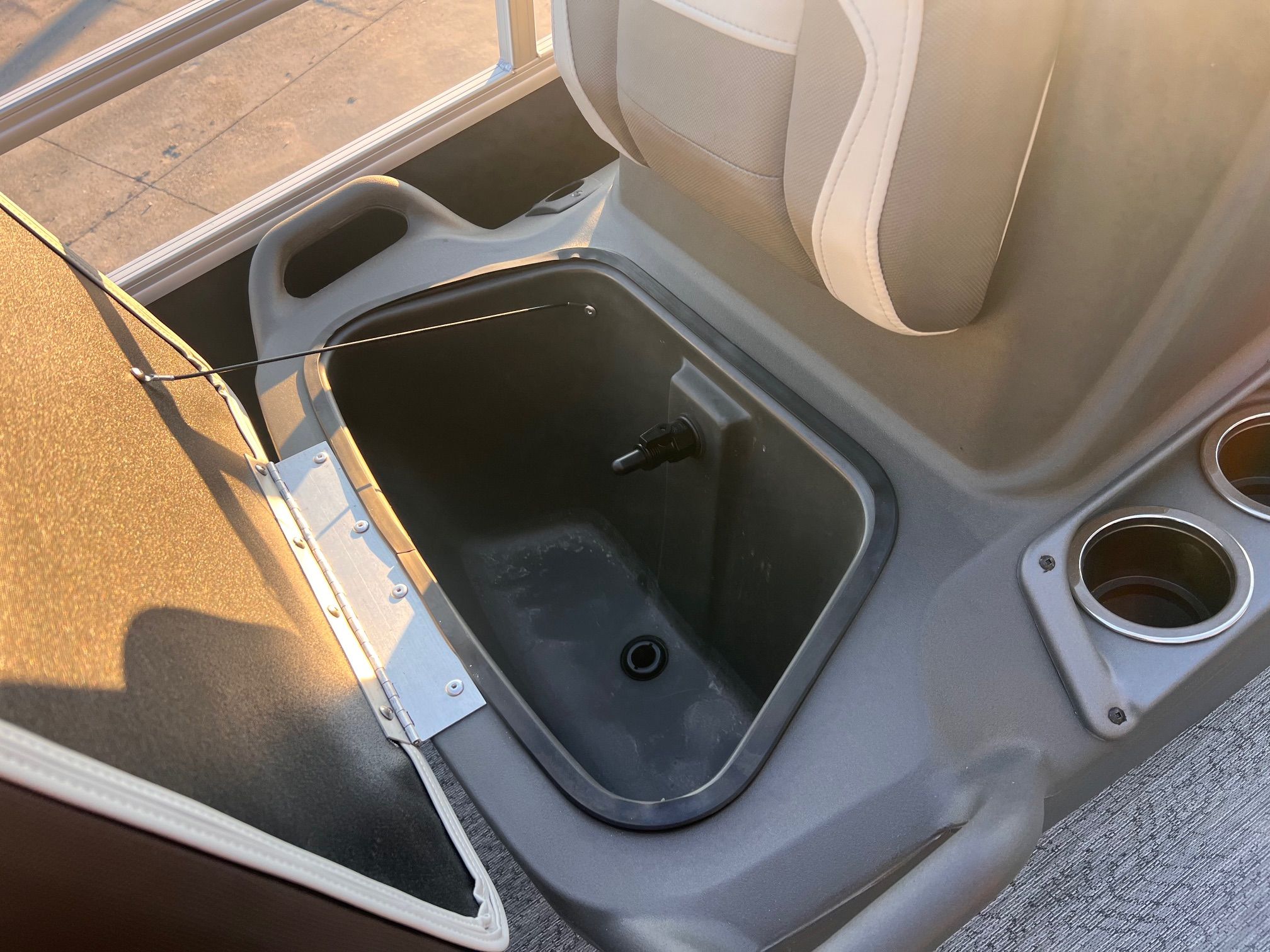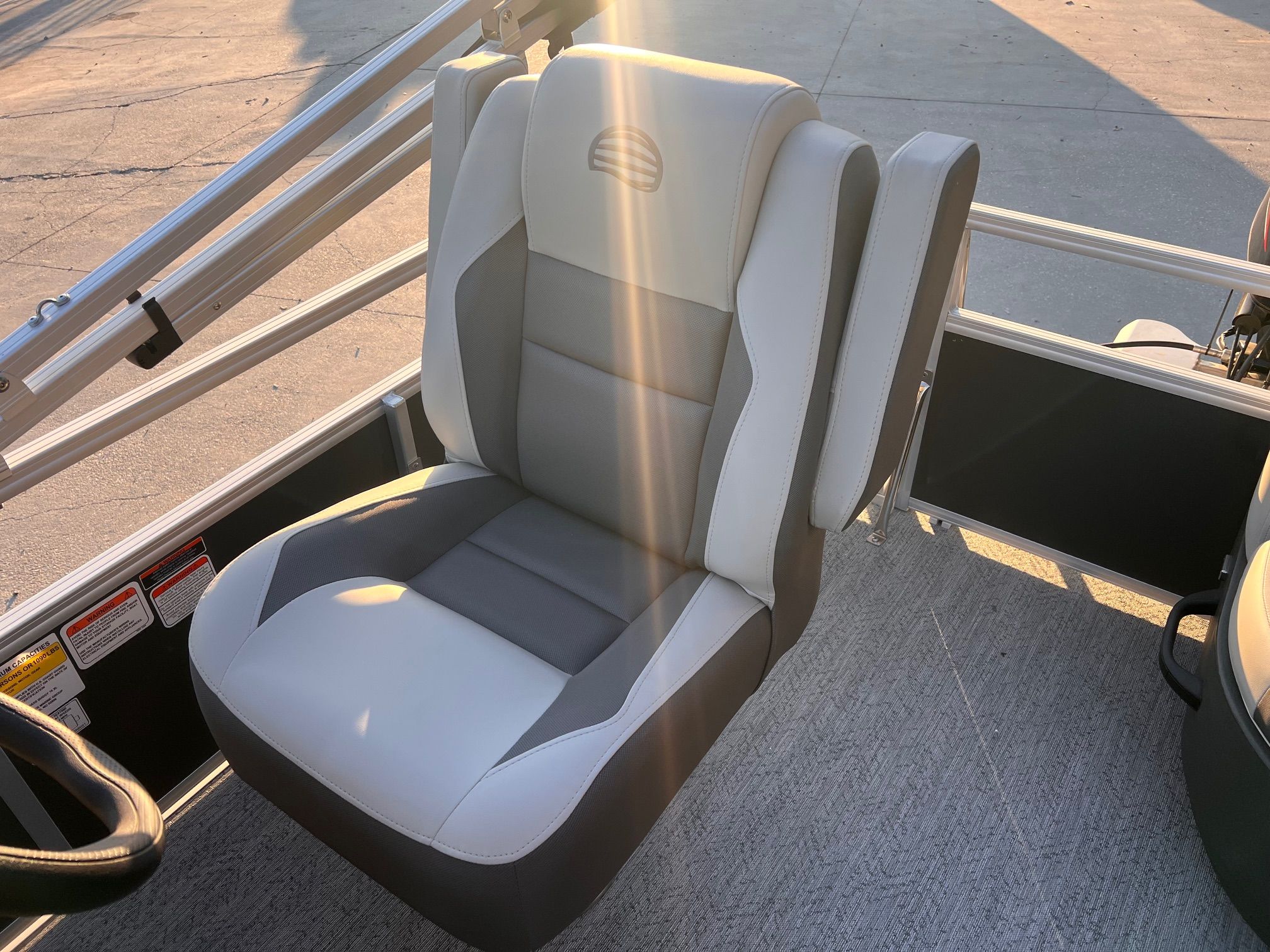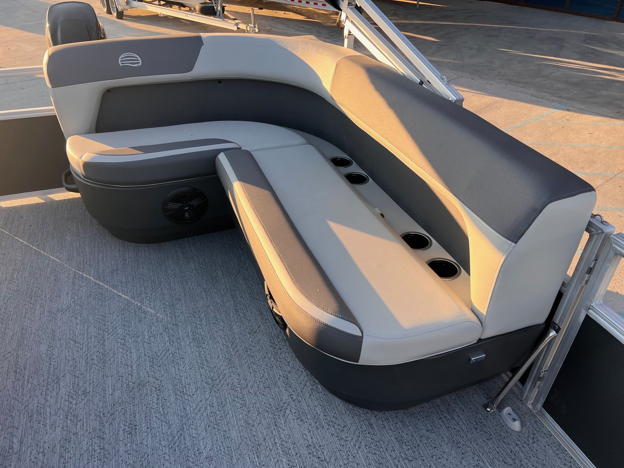 This seven-passenger fishing pontoon hits the water with new console and lounge designs. Get three extra cubic feet of storage thanks to clever backrest cut-outs. The redesign also adds a seat in front of the driver console, phone compartments, and four more cupholders. Cast from the shade of a standard 7' bimini top in one of the two folding fishing seats. Find your spot on the lake from the decked-out driver console, which comes with its own rod holder.
